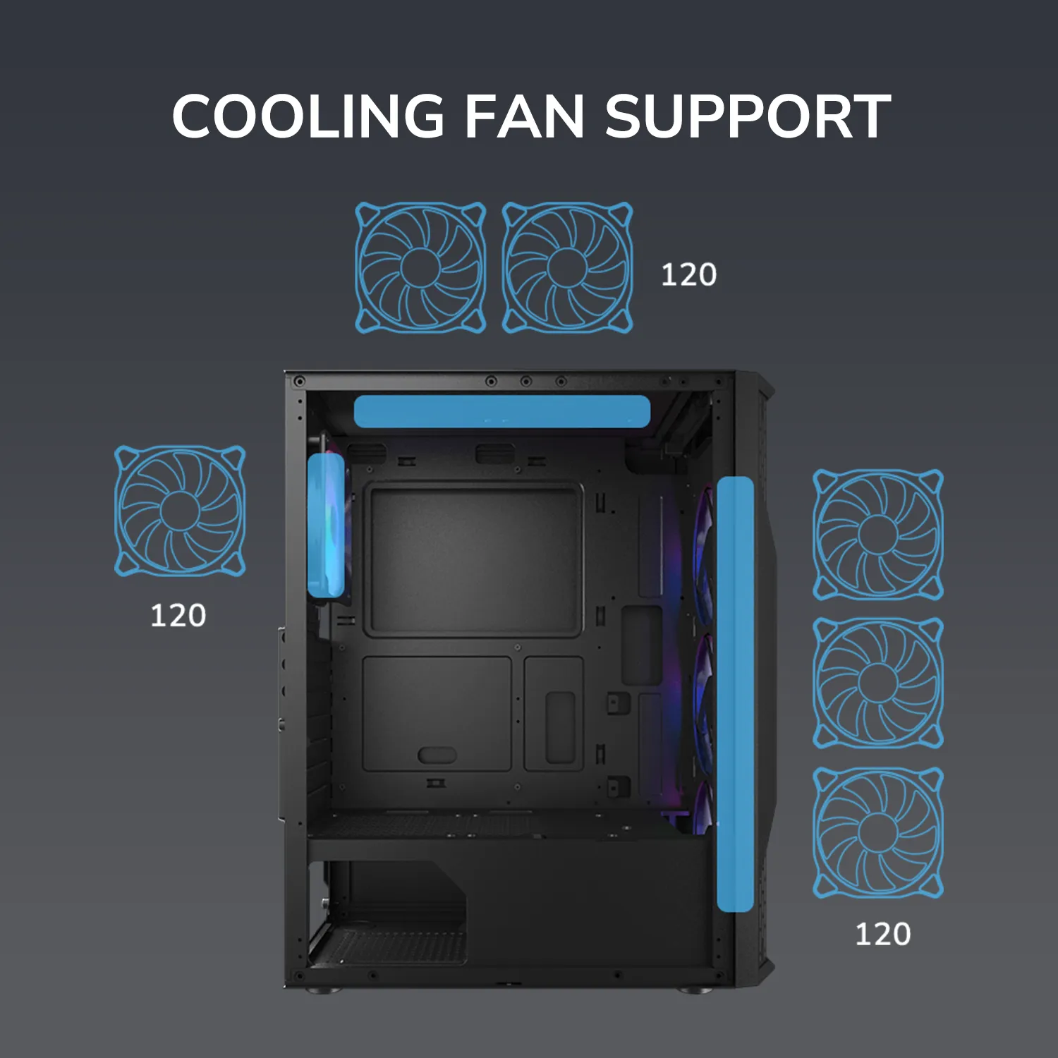 Предустановленные 3x120-мм вентилятора RGB с фиксированным режимом спереди и дополнительный 120-мм вентилятор RGB сзади охлаждают вашу систему сразу после распаковки, придавая ей стильный вид, который можно расширить до 6x120-мм вентиляторов. Поддержка радиатора AIO до 240 мм ИЛИ воздушного охладителя высотой до 158 мм гарантирует, что ваша установка будет поддерживать оптимальную температуру даже при высокой температуре.
